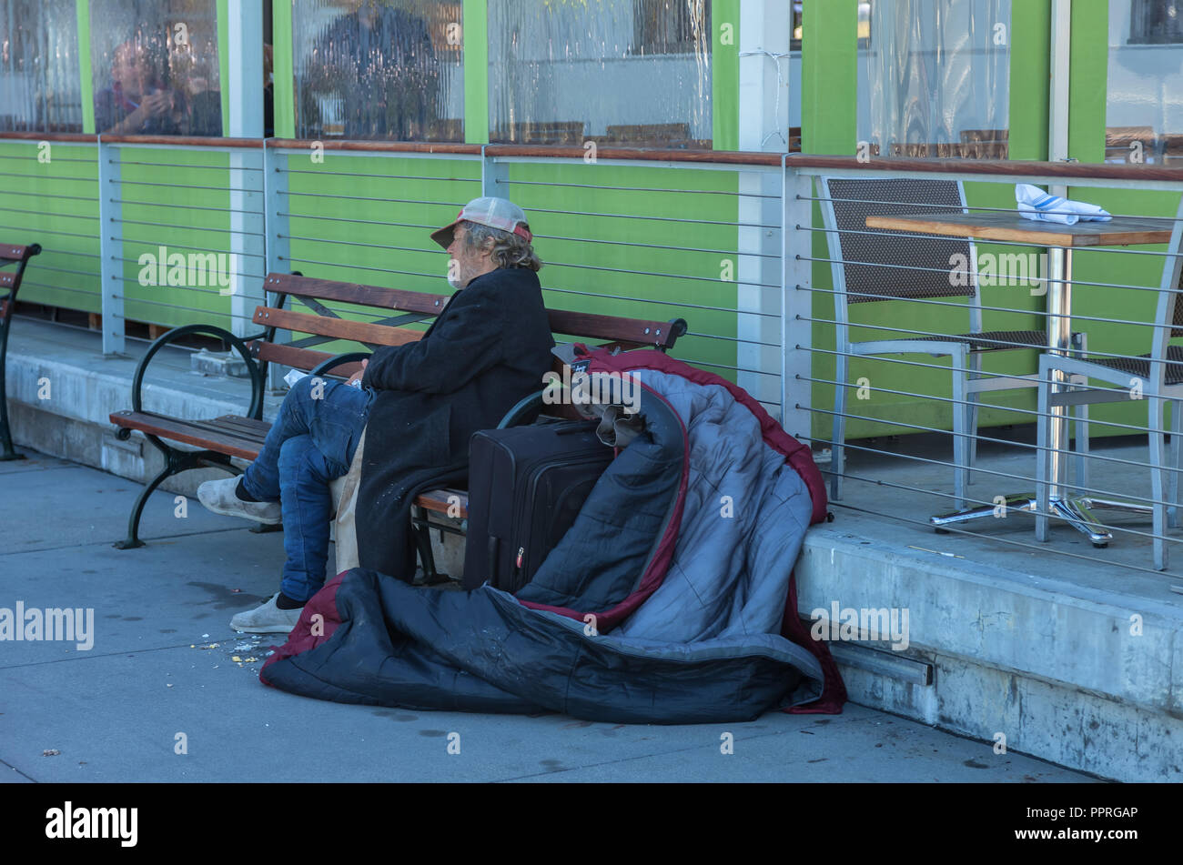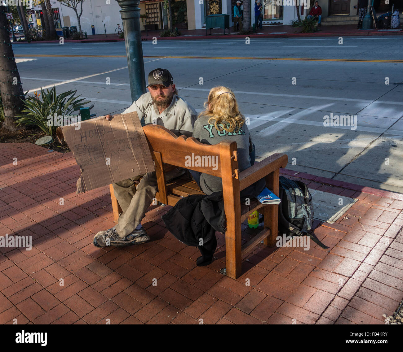 A Homeless Married Couple Begs While Sitting On A Bench On State