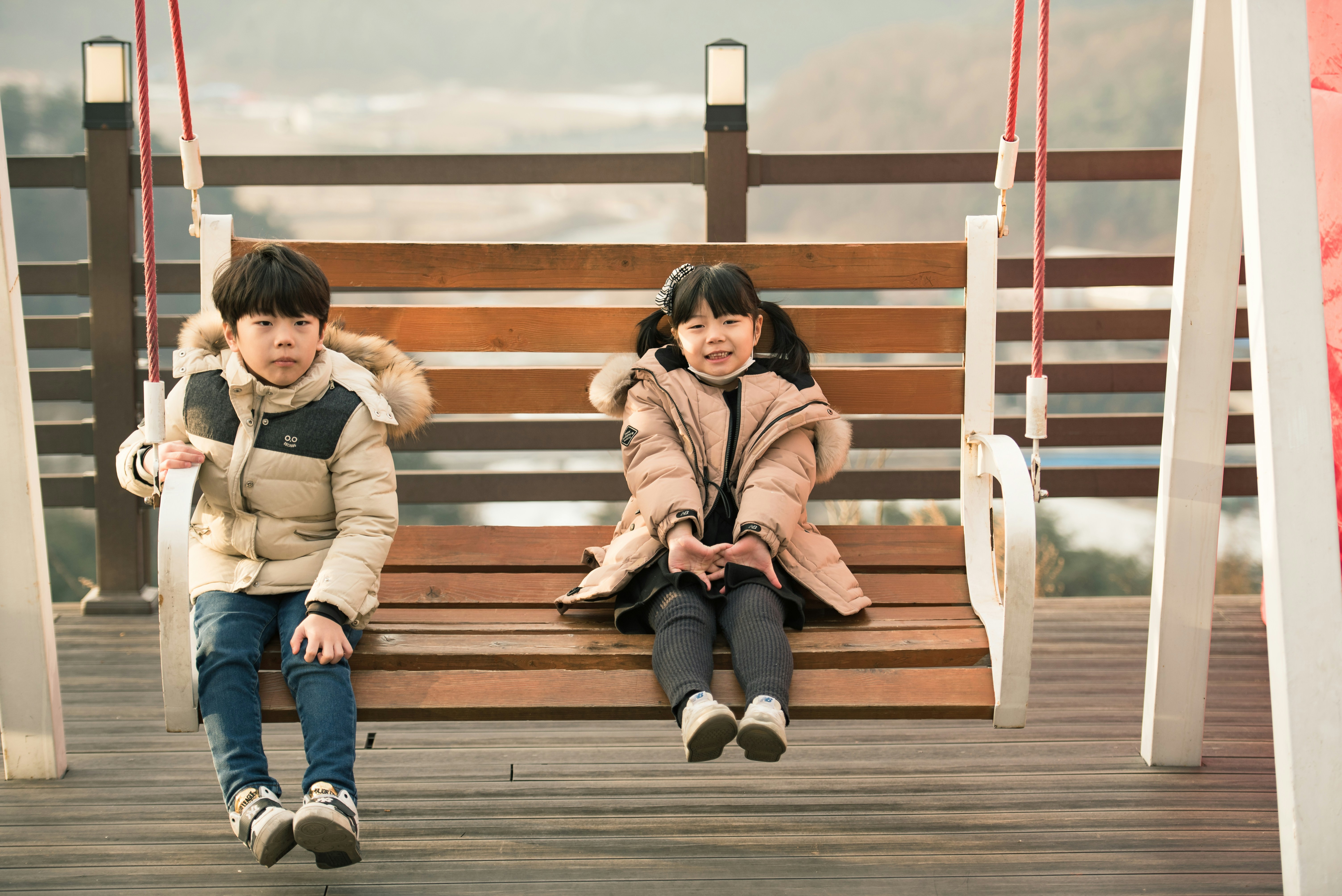 Two Children Sitting At Hanging Bench Photo Free Shoe Image On