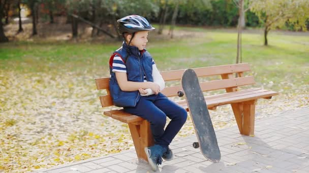 White Boy With Broken Arm Sitting With Skate Stock Video