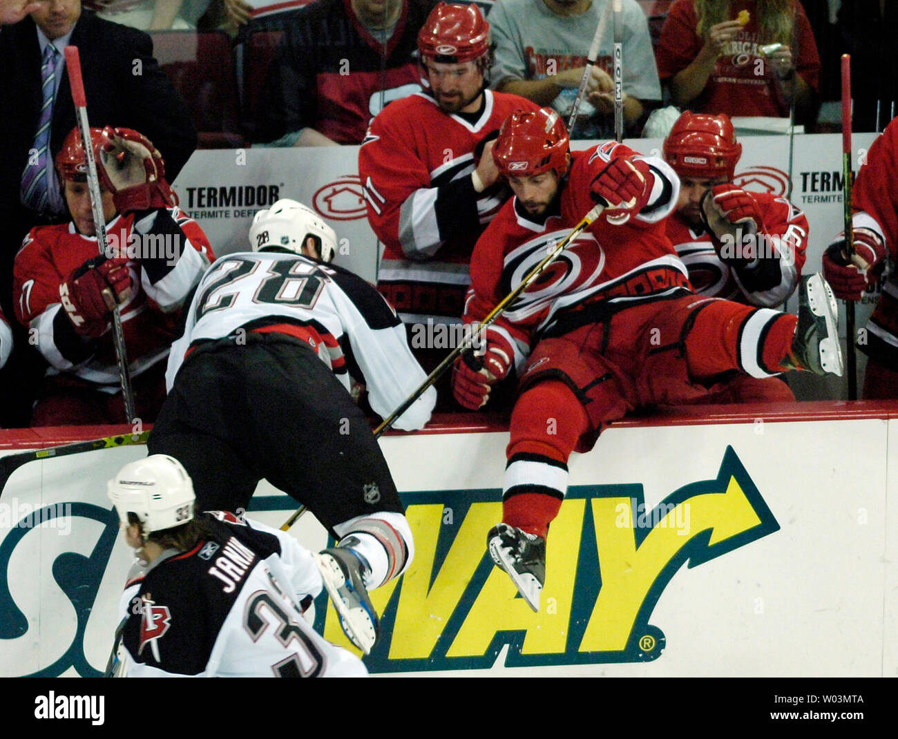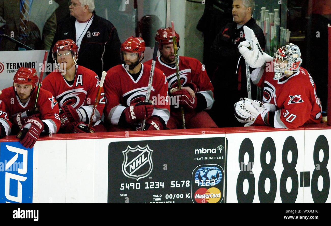 Carolina Hurricanes Goaltender Cam Ward Right Sits On The Bench