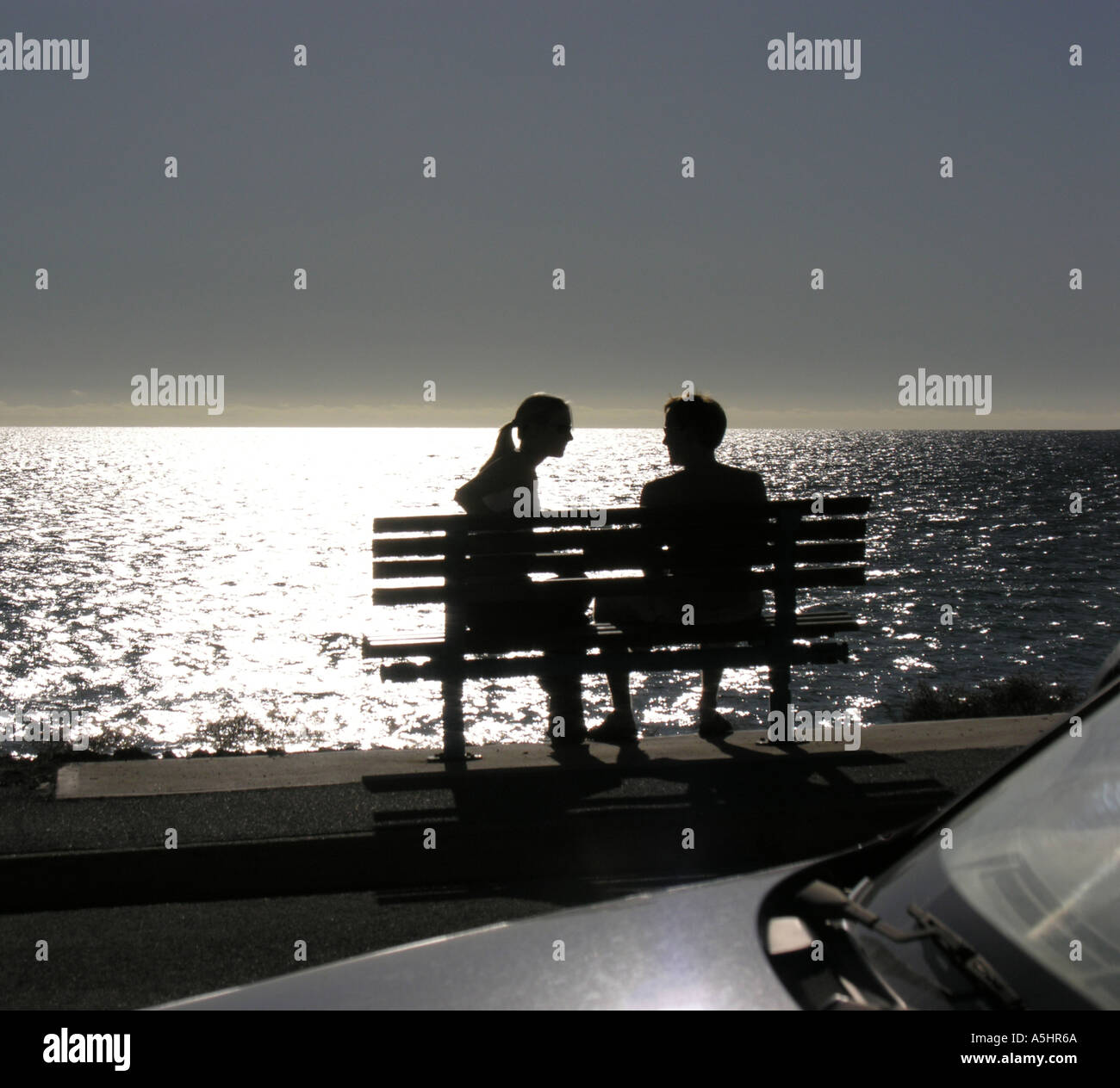 Boy And Girl On Bench At Sea With Car In Foreground Stock Photo