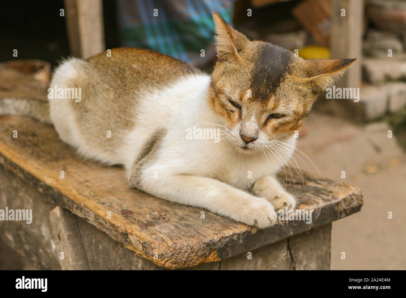 Lovely Cat Sitting On A Wooden Bench The Lovely Cat Sitting On A