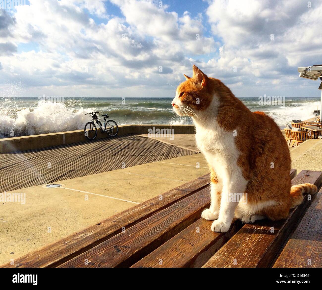 Red Cat Sitting On The Bench Against Stormy Sea Stock Photo