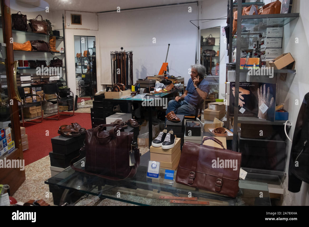 Leather Shoe And Bags Shop Cobbler Owner In His Shop Surrounded