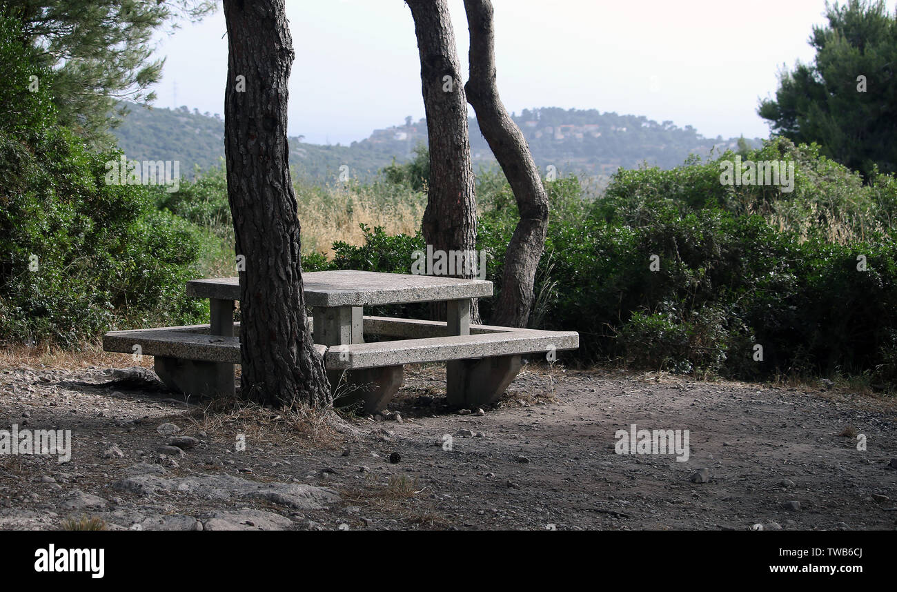 Concrete Bench And Picnic Table In Forest Stock Photo 256558082