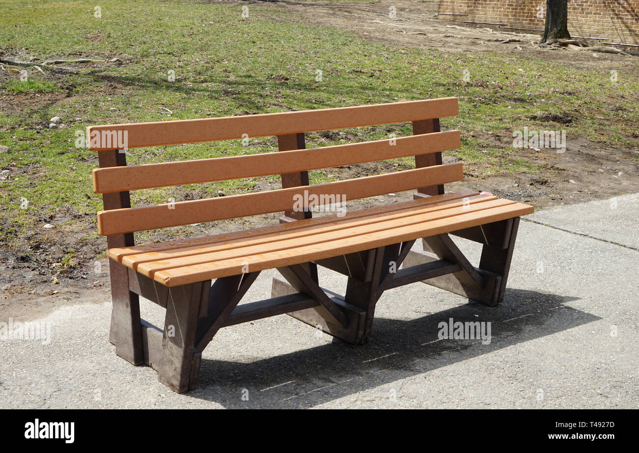 A New Compose Park Bench Sits On Concrete Near A Grass Area Stock
