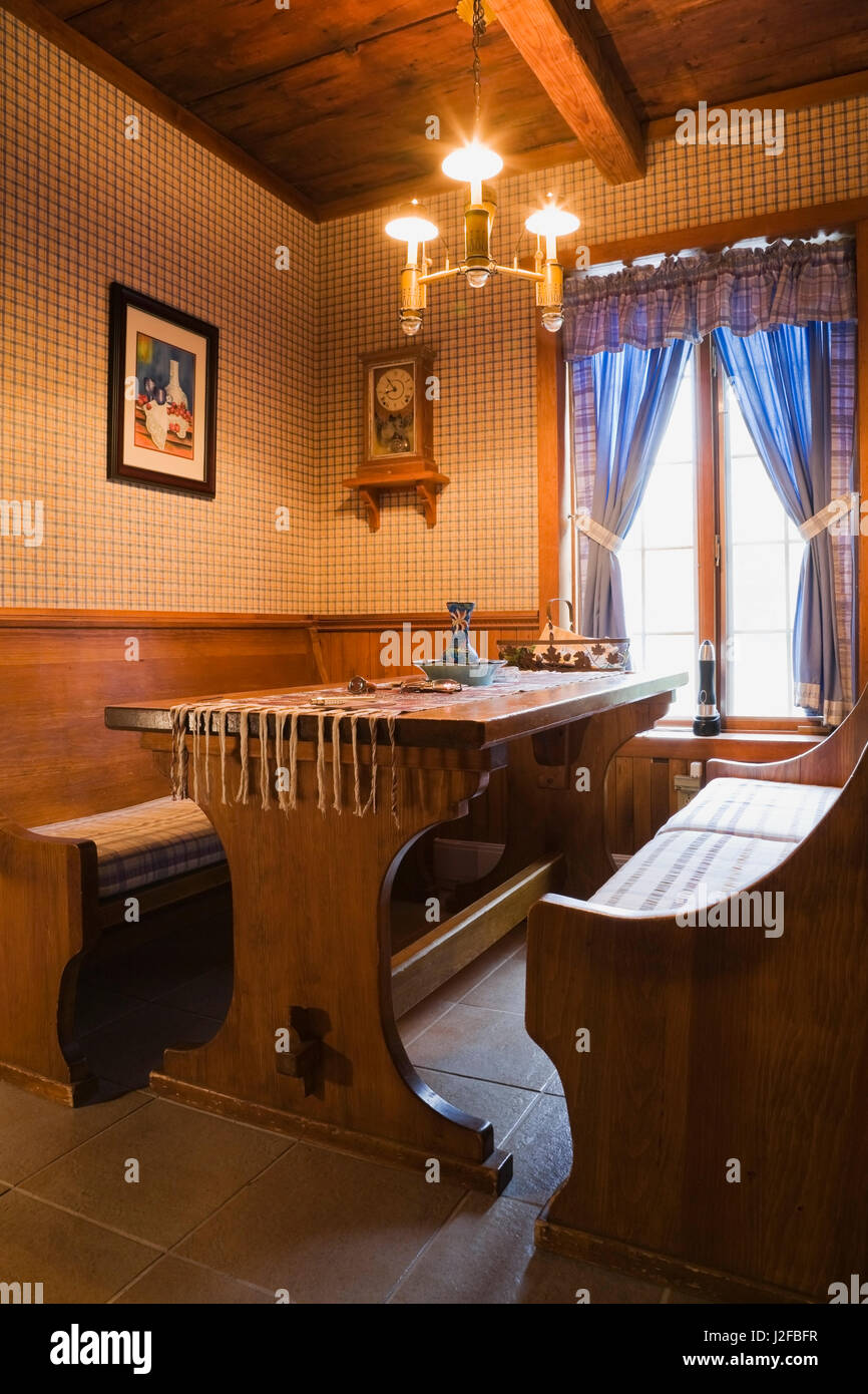 Breakfast Table And Wooden Sitting Benches In The Alcove Next To