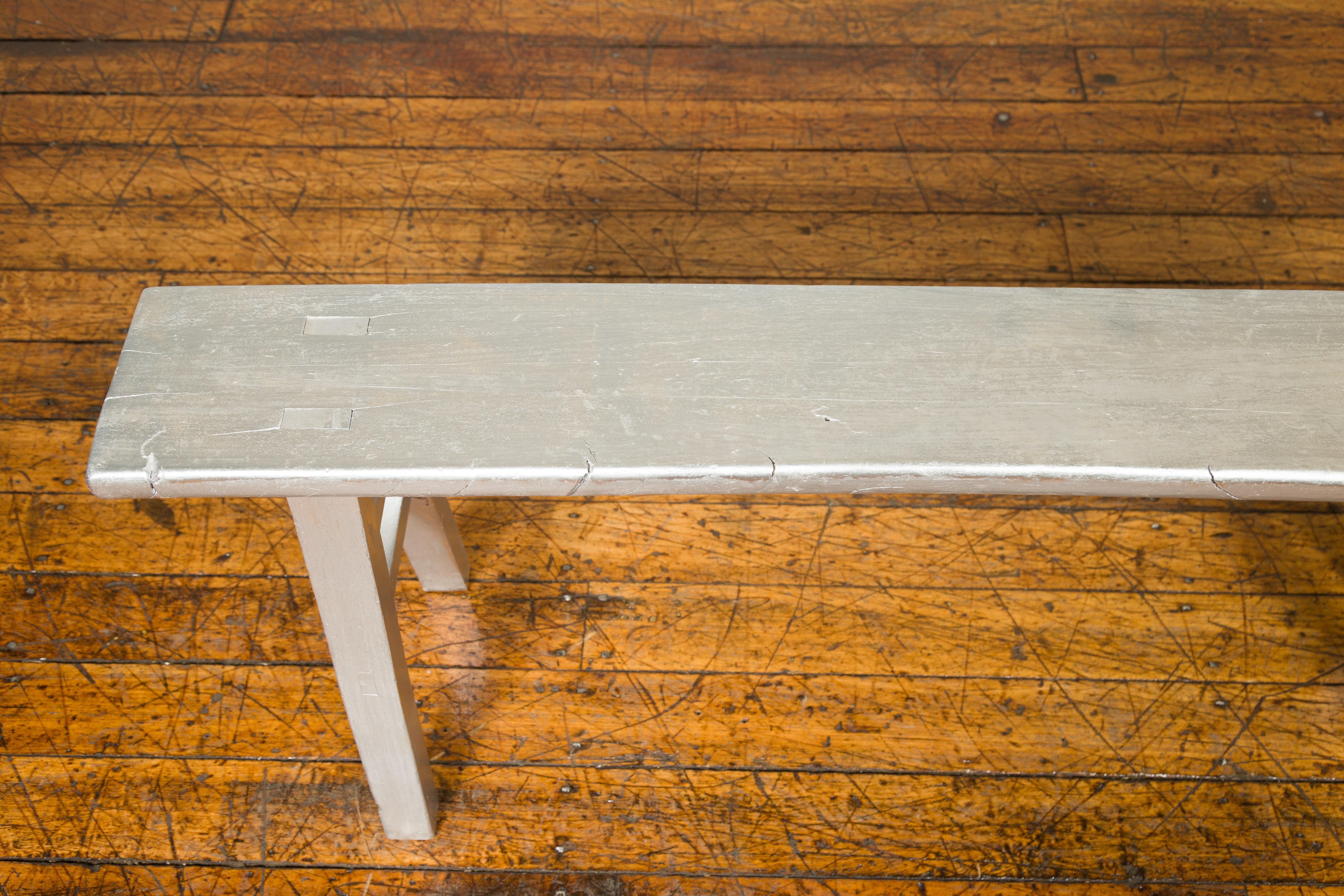 Chinese Contemporary Silver Colored Wooden Bench With A Form Base