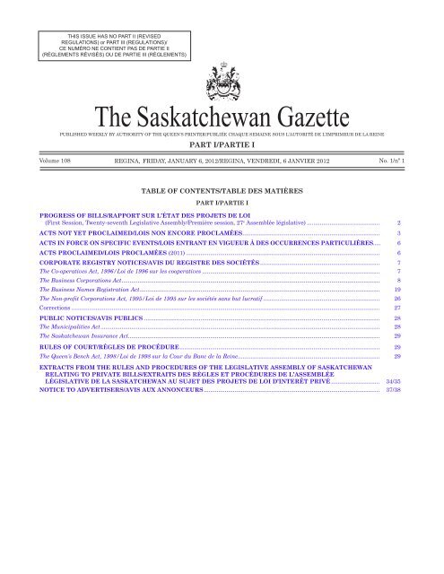 The Saskatchewan Gazette Queen S Printer Government Of