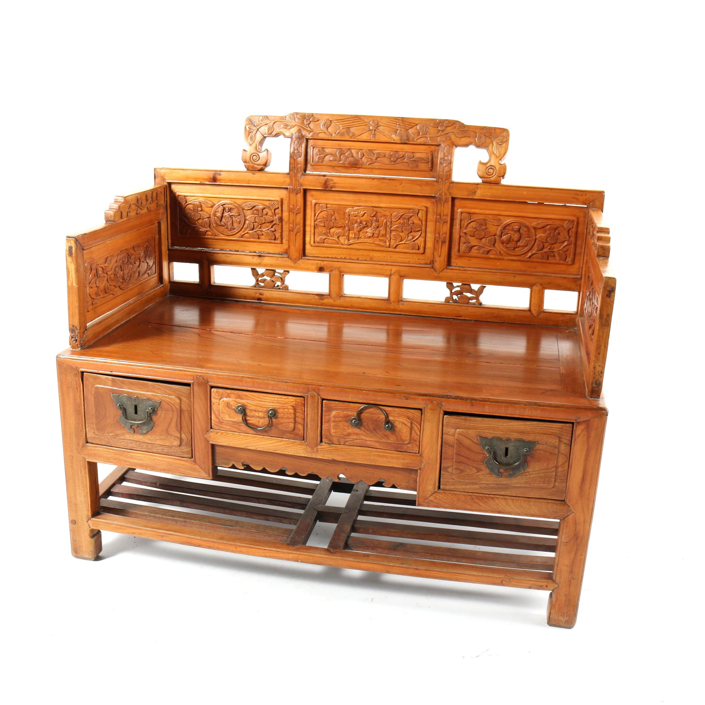 Vintage Korean Carved Wood Bench With Storage Drawers Ebth