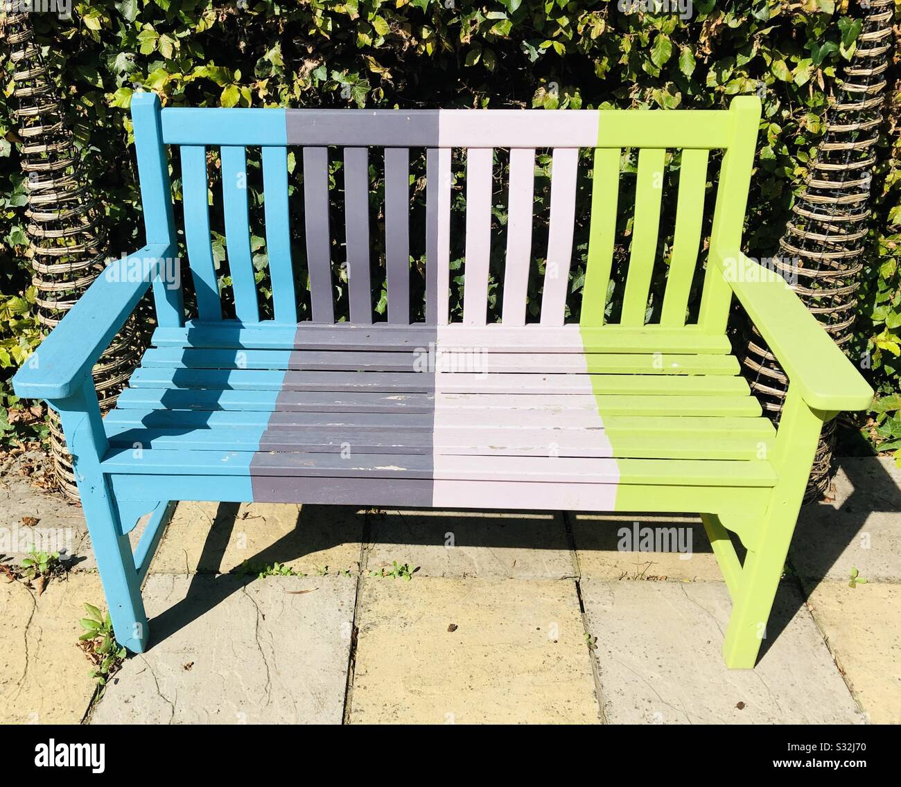 Multi Coloured Garden Seat Waiting In The Sun Stock Photo