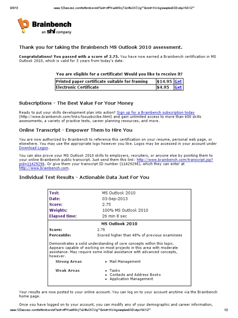 Brainbench Ms Outlook 2010 Certifcate Public Key Certificate