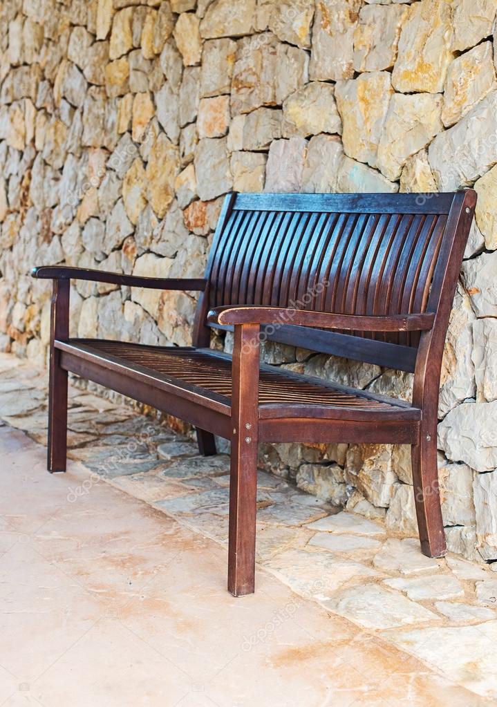 Street Wooden Bench Against Brick Wall Stock Photo