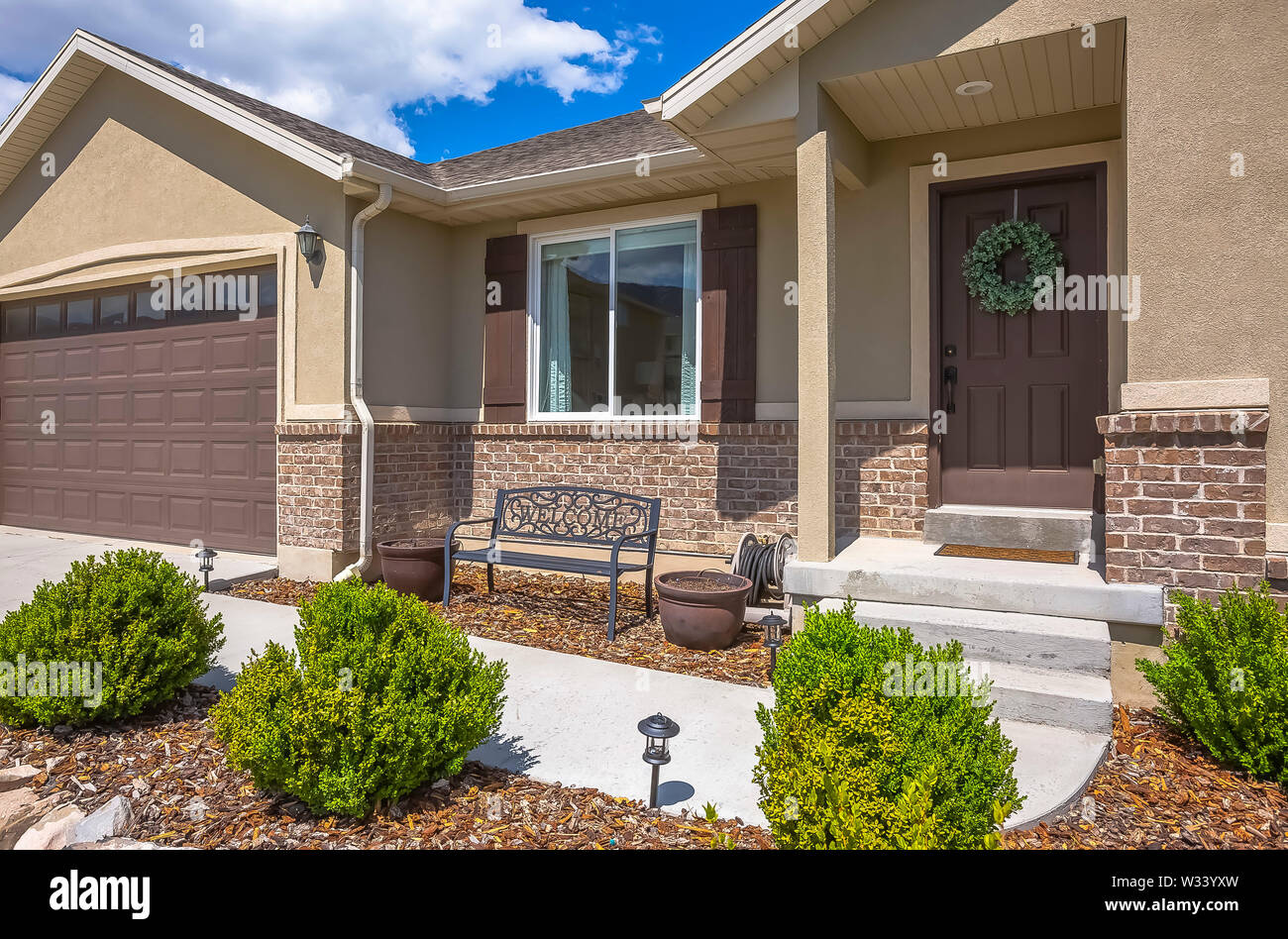 Home With A Mix Of Concrete And Brick Wall Against Blue Sky With