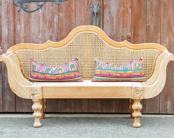 Sheraton Bench Sun Carving Backrest Teak Wood Frame Rattan Seat