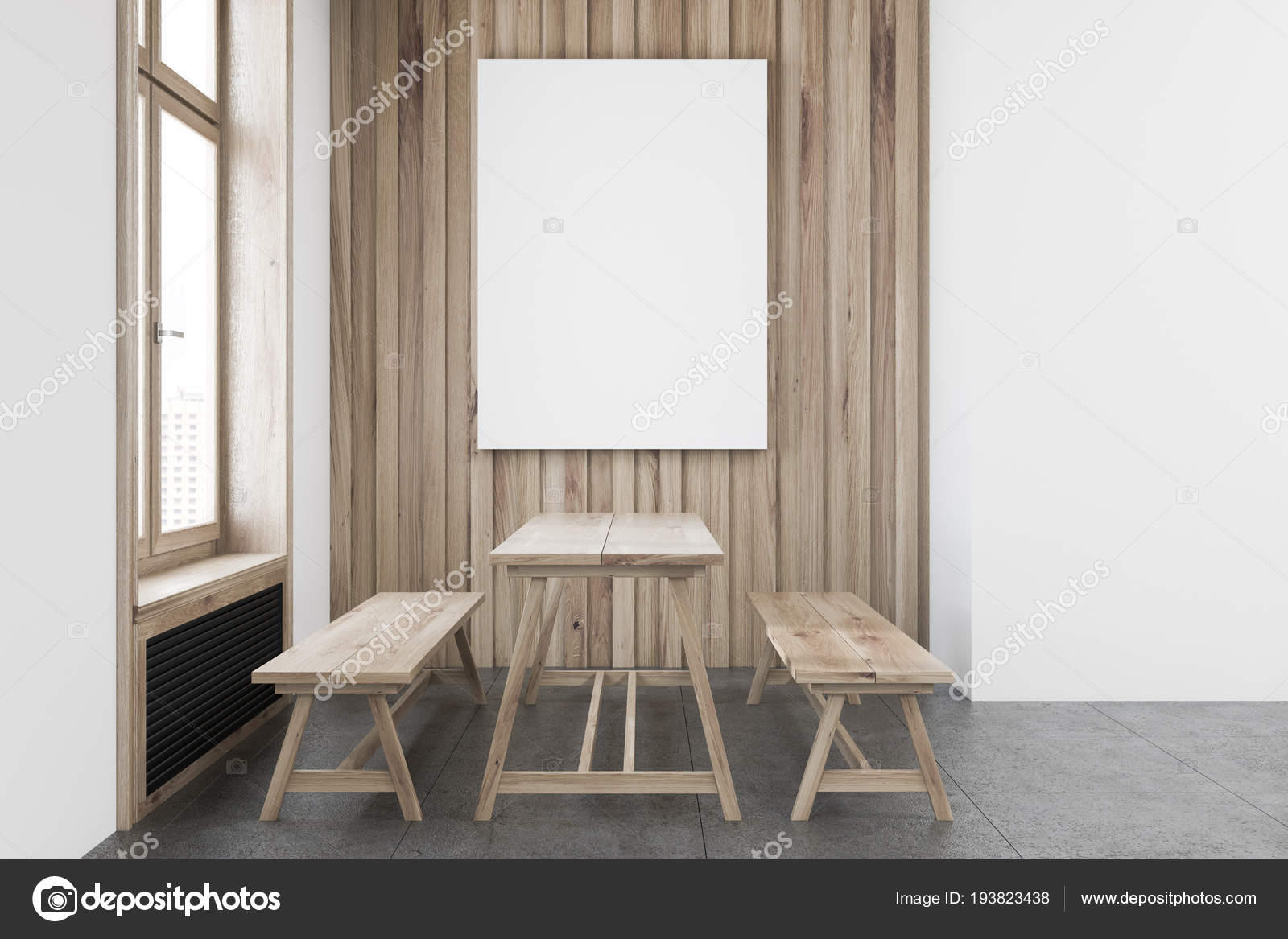 Wooden White Wall Cafe Interior Concrete Floor Wooden Tables