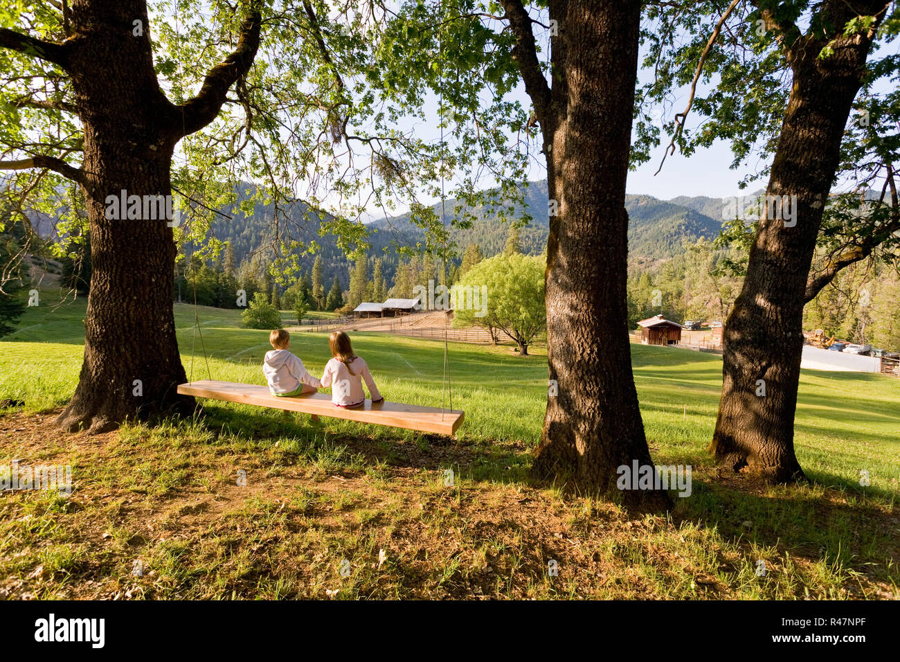 Children Holding Hands On Bench Swing Under Oak Trees Bar 717