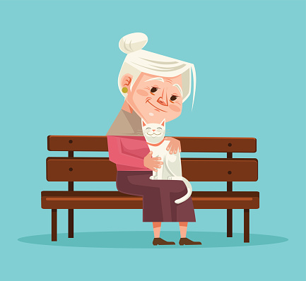 Old Woman Character Hold Cat Character Sitting On Bench Stock