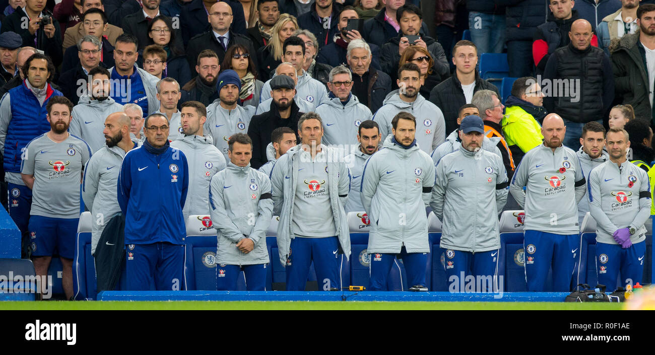 The Chelsea Bench Including Chelsea Manager Maurizio Sarri And His