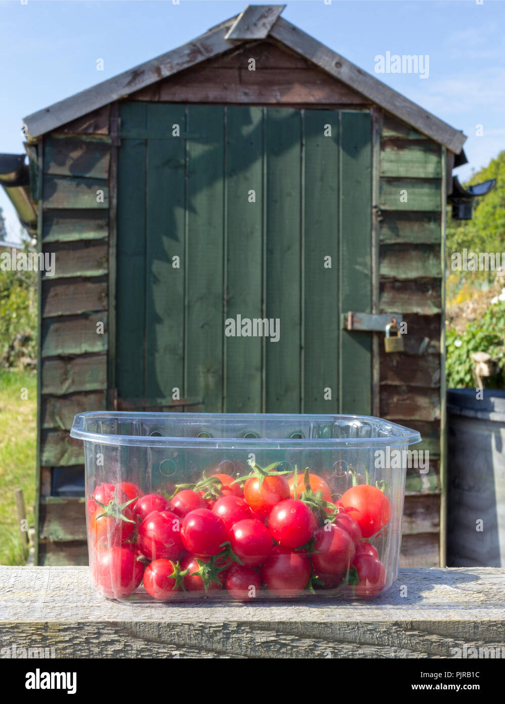 A Clear Plastic Punnet Containing Freshly Picked Tomatoes On A