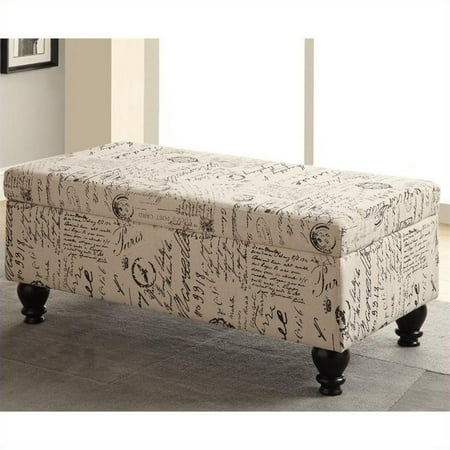 The description says french script storage bench off white and grey. The plush deeply tufted top of this coaster furniture lawndale storage bench features soft close hinges and reveals plenty of open storage space inside. It came in a big unwieldy box and i will have to make it work as i dont want to go through repacking it to return.