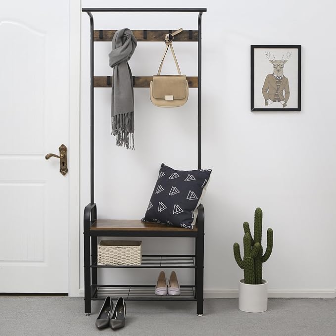 Hoobro coat rack shoe bench pipe style hall tree organizer entryway storage shelf with unique double hooks wood look accent furniture with metal frame industrial design rustic brown. A hall bench and coat r.