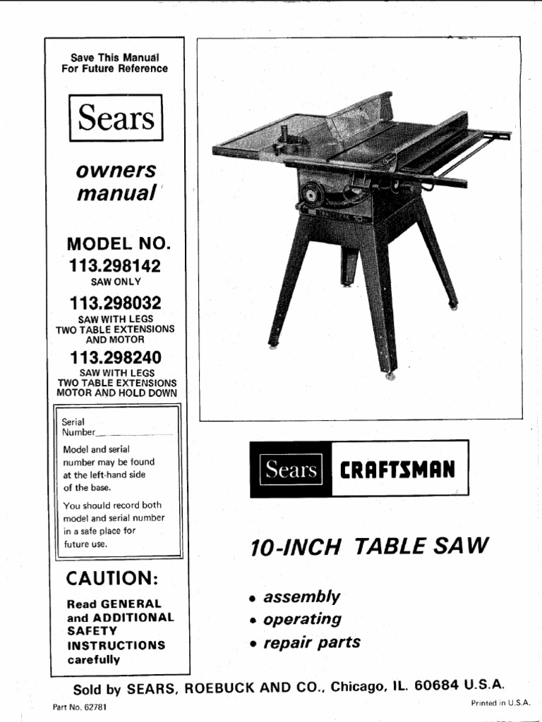Craftsman Craftsman 10 Inch Table Saw Owner Manual Electrical
