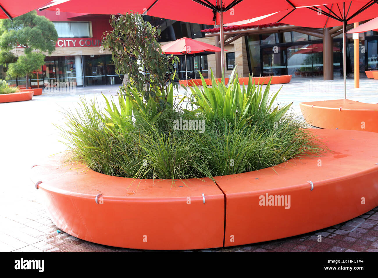 Garden Plants Being Planted In The Middle Of Concrete Bench Stock