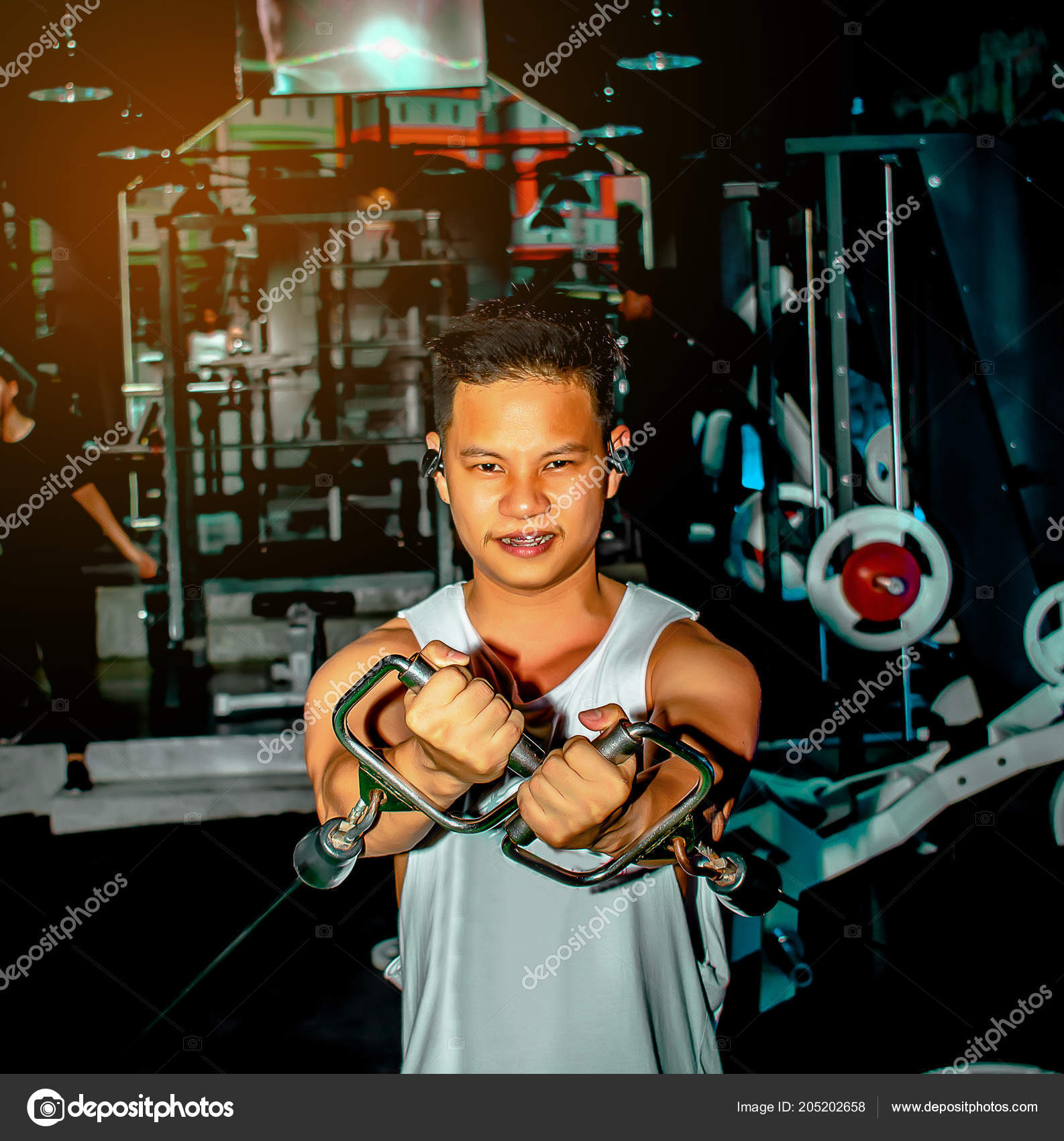Asian Men Exercise Chest Workout Bench Press Cable Machine
